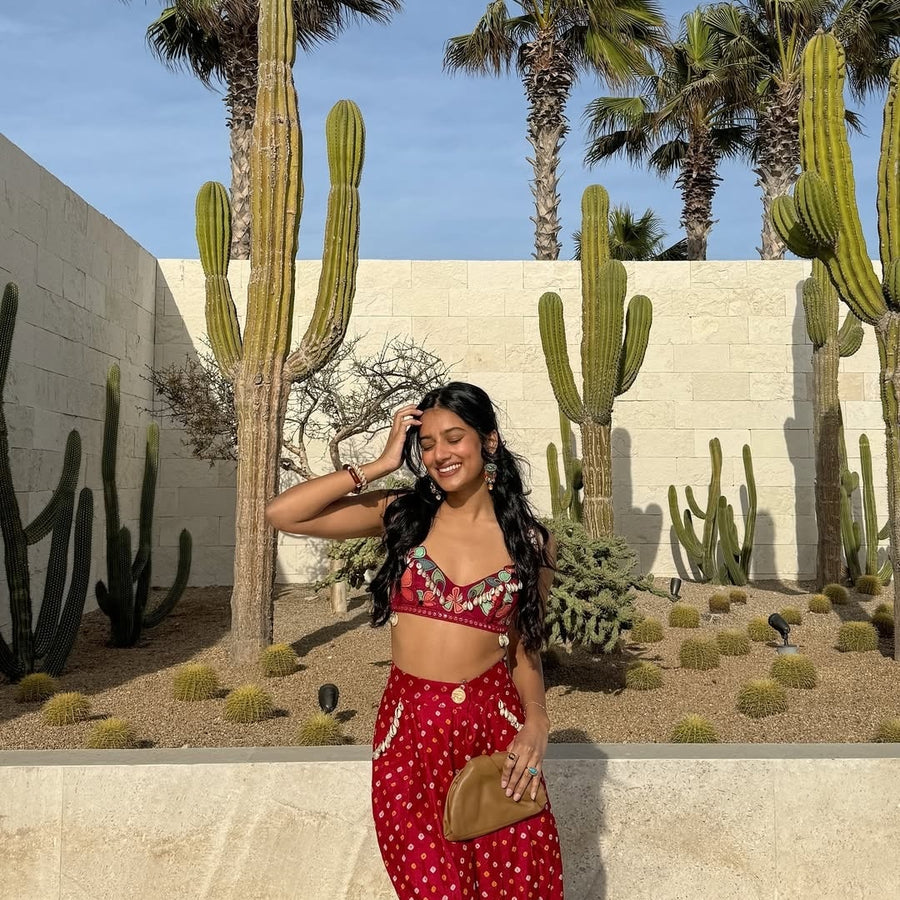 Bralette - A gauze bralette hand embroidered with abstract red flowers and cotton bow ties for straps.